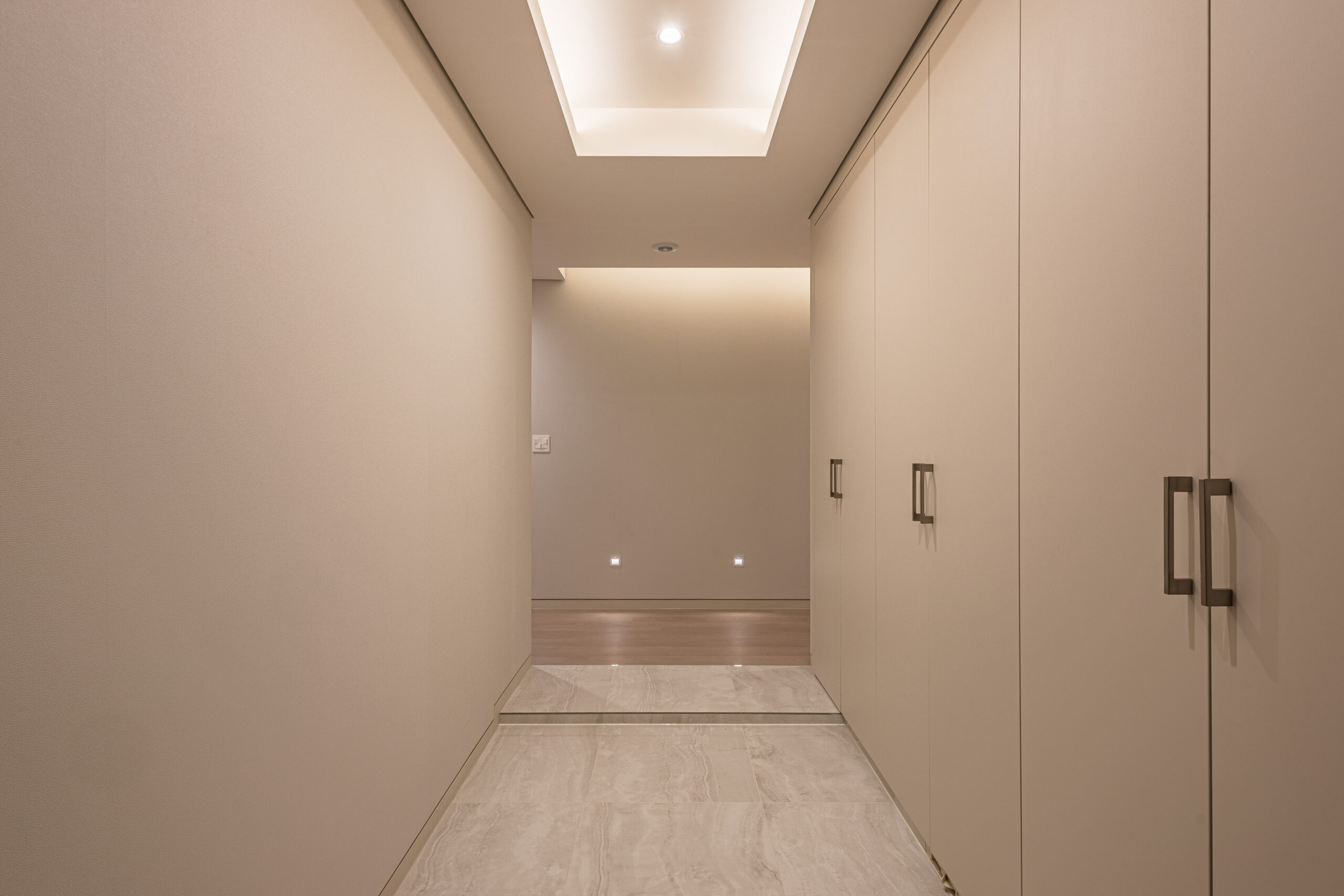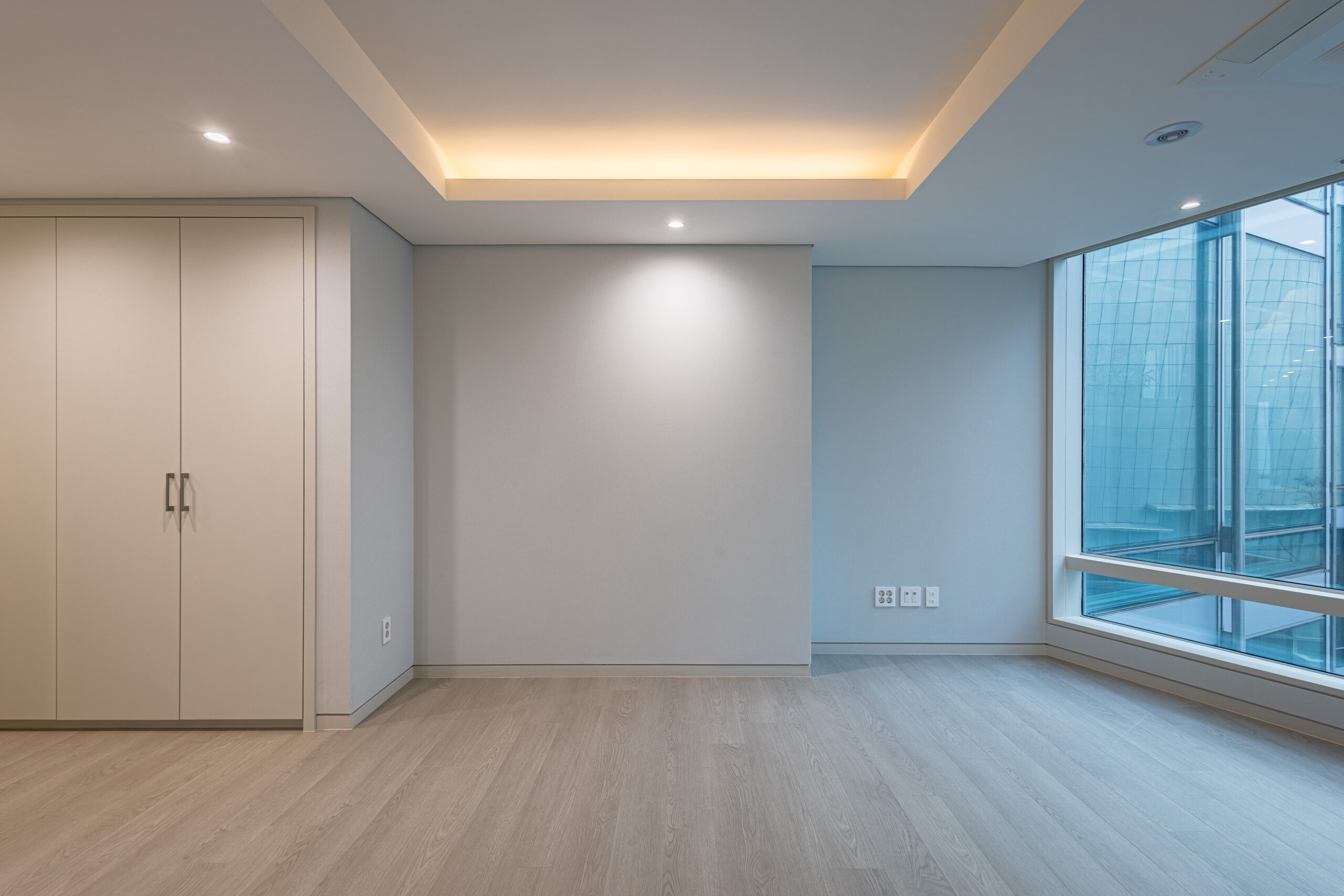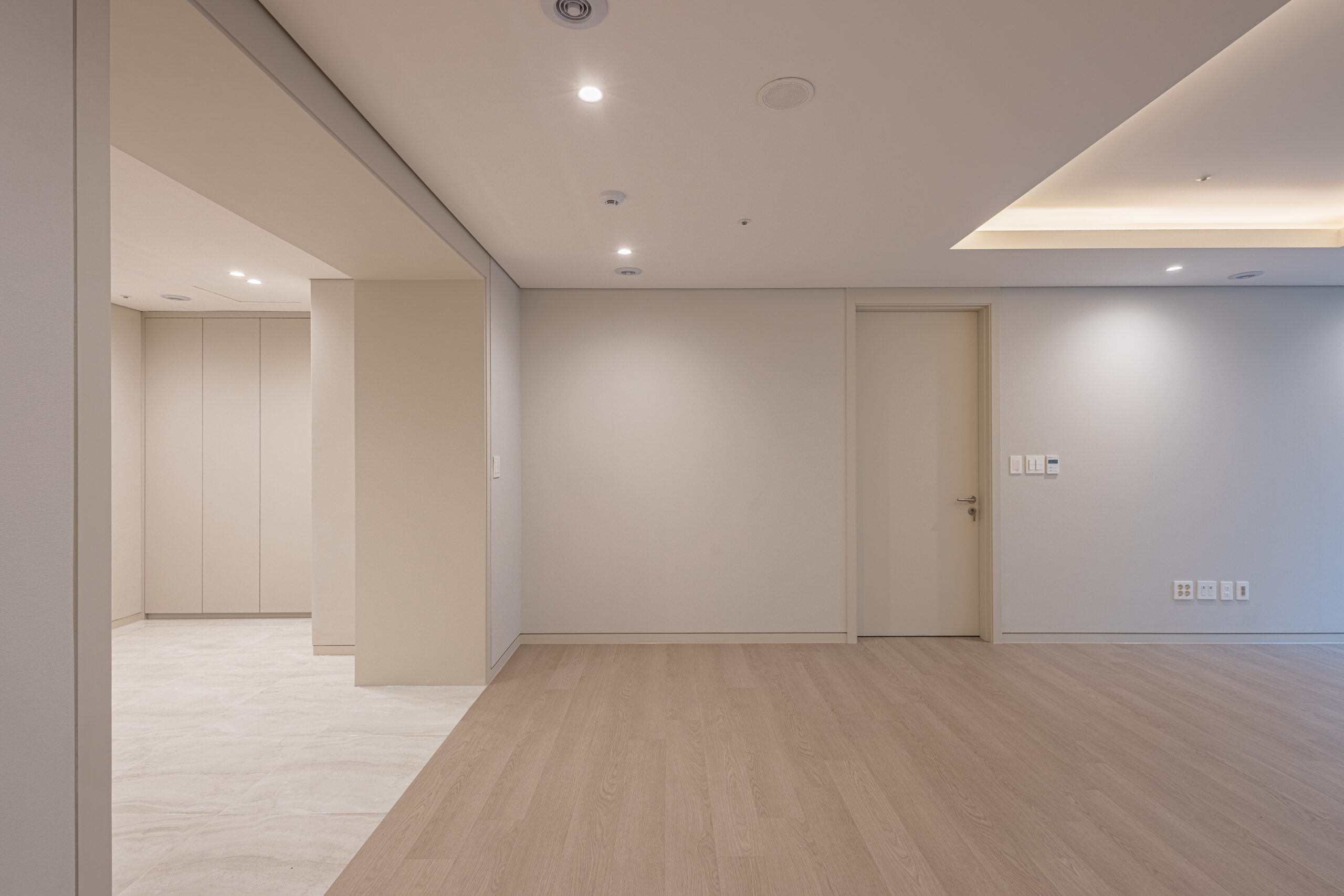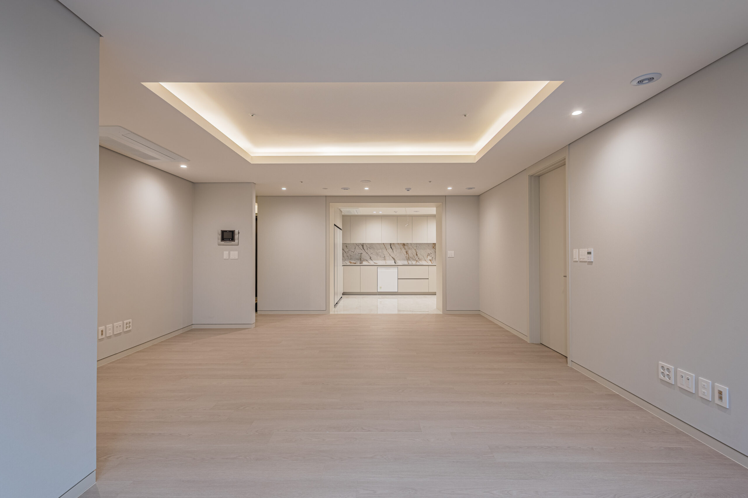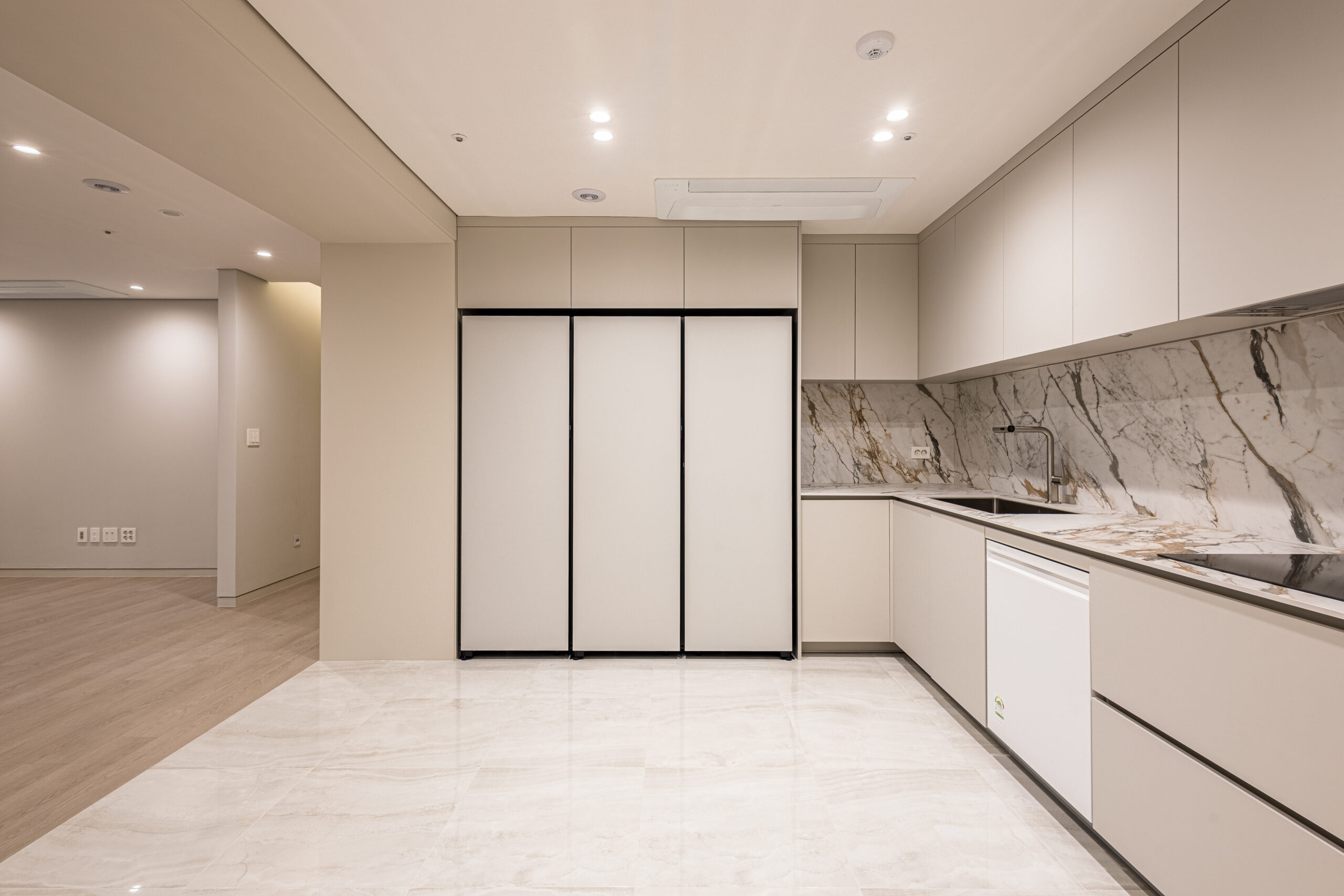 웜그레이 톤의 도장과 벽지, 톤다운된 강마루와 필름 리폼 가구로 모던하고 따뜻한 분위기의 가성비 좋은 인테리어를 구현하였습니다.